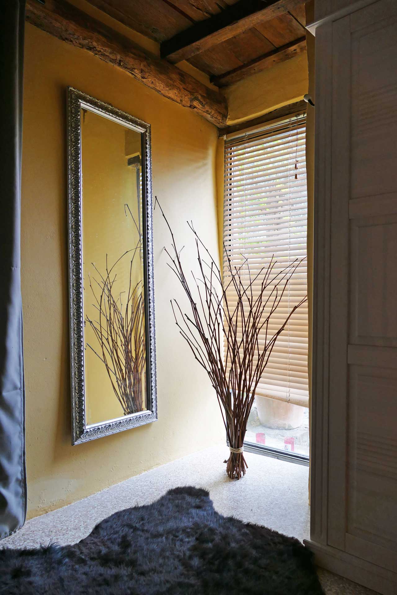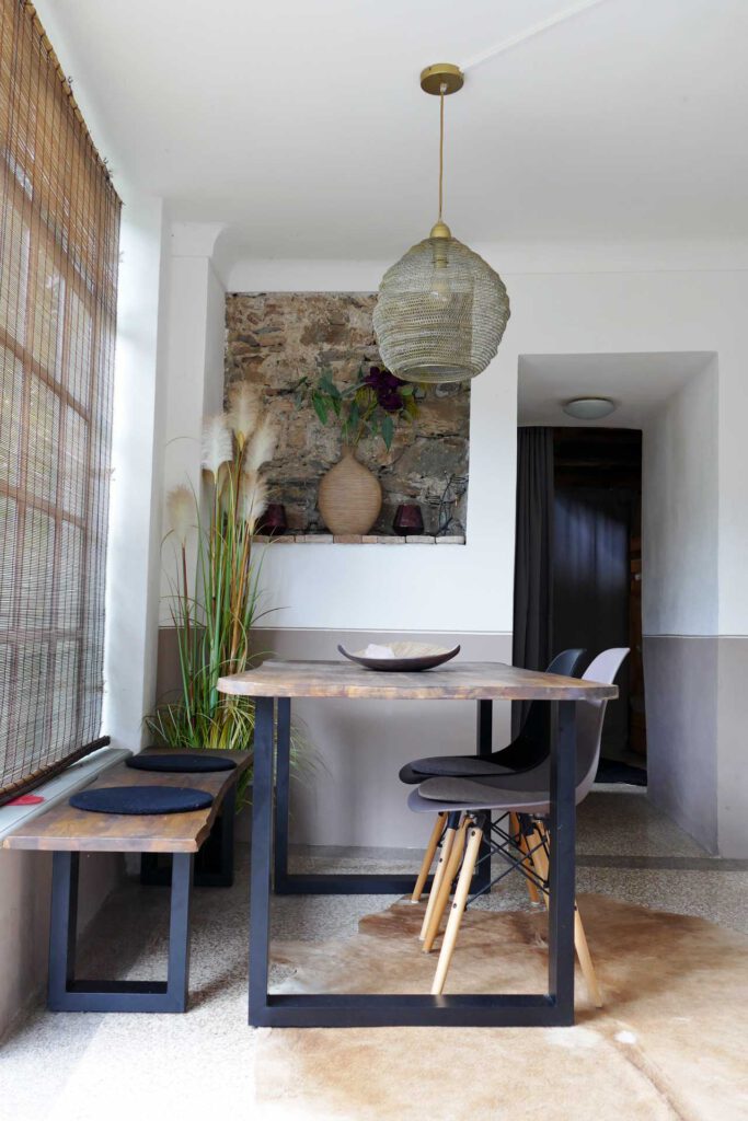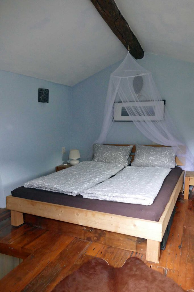 Zwei der drei Schlafzimmer befinden sich im Erdgeschoss. Das dritte Schlafzimmer befindet sich im 1. Stock und ist nur über eine Holztreppe erreichbar.